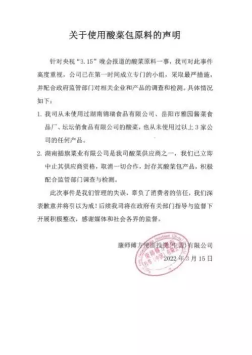 聲明稱,湖南插旗菜業有限公司向江門、武漢、西安、新疆的共4家工廠提供酸菜,「我們已終止其供應商資格,取消一切合作,並啟動對相關產品的下架回收」,積極配合監管部門的調查與檢測。「我們再次深表歉意,將持續加強供應商管理,並且請公眾媒體和社會各界一同來監督。」