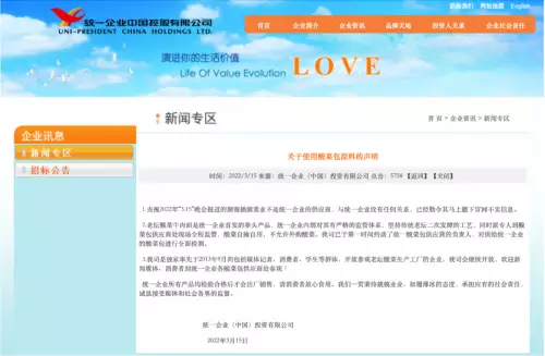 3月15日晚,統一企業中國控股有限公司回應,湖南插旗菜業不是統一企業的供應商,與統一企業沒有任何關係,已經勒令其馬上撤下官網不實信息。統一已於第一時間約談了統一酸菜包供應商的負責人,對供給統一企業的酸菜包進行全面檢測。