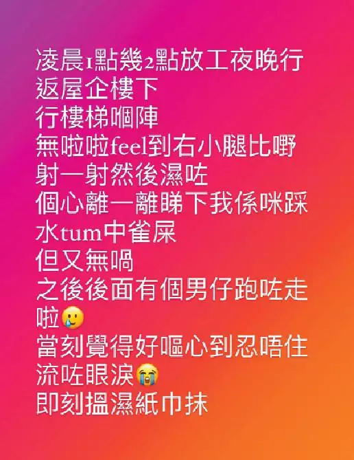 Maggie說:「夜晚行返屋企樓下,行樓梯嗰陣無啦啦Feel到右小腿畀嘢射一射然後濕咗。個心離一離睇吓我係咪踩水氹、中雀屎,但又無喎。」Maggie同時驚覺有一男子尾隨她,被她發現即跑走,Maggie坦言:「當刻覺得好嘔心,忍唔住流咗眼淚,即刻搵紙巾抹。」Maggie當時已用濕紙巾及酒精消毒,但不知被甚麼液體射濕小腿,她亦呼籲大家深夜回家時定要加倍小心!