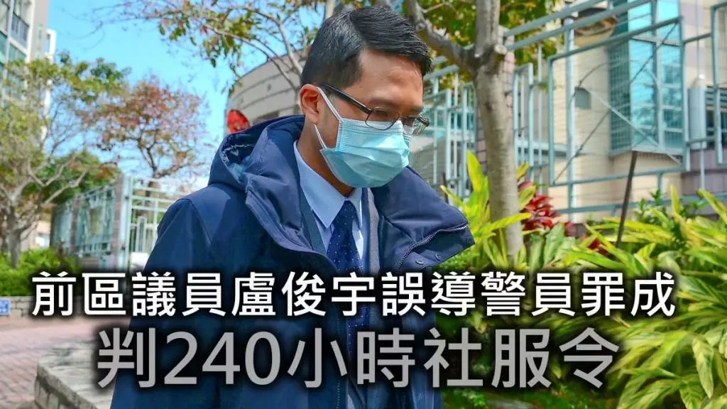 民主黨前屯門區區議員盧俊宇前年在Facebook發文,稱他出席元朗721事件相關活動期間,被警員反手捉緊帶回警署,隨後又刪除帖文。他早前被裁定浪費警力罪罪成,今在粉嶺裁判法院判刑。裁判官水佳麗斥盧身為區議員卻發放假資訊,在帖文中代入自己是遭警方不義對待的主角,令市民對警隊產生厭惡和不信任,惟慮及他背景良好,判處240小時社會服務令。