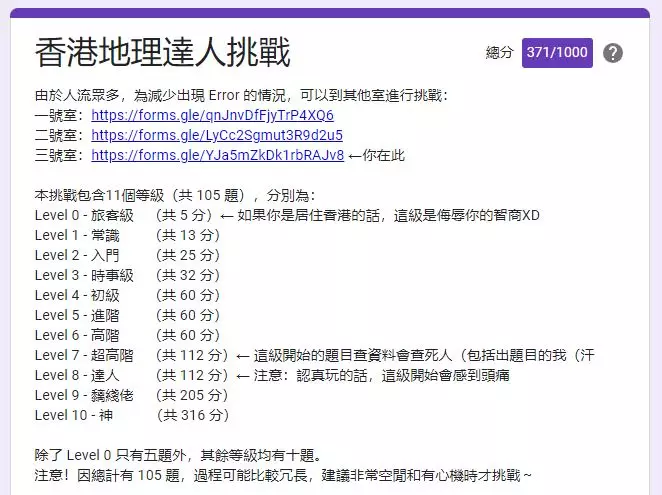 這個測驗總共有105題,滿分共有1000分,種類範疇繁多,難度分10級拾級而上,由最簡單的「旅客級」,去到最難的「神級」,最後一批問題就連用Google查資料也很難搜尋到。不少網民完成測試後,紛紛在社交平台貼上自己的分數「互相炫耀」,亦有人感嘆自己對香港認識太少。