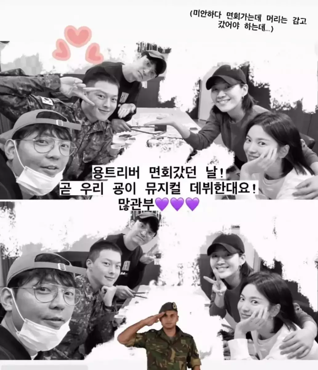 至於《現正分手中》拍檔張基龍,正在當兵的他近期參演陸軍音樂劇,早前在出席電台宣傳時,他就提及宋慧喬和《現正分手中》團隊曾經到軍隊探望他,給了他很大的力量。日前同劇演員崔嬉序亦終於分享了和宋慧喬以及朴孝珠、金柱憲等一齊前往軍隊探望張基龍時的合照,其中一張黑白照中喬妹亦有入鏡,另一張就特別標註了是由喬妹負責揸機掌鏡。崔嬉序發文時亦幫忙宣傳張基龍將以音樂劇演員身份出道,希望能大家多多支持,又向他喊話:「基龍啊,我們來探你的事你一生都不准忘記啊你這小子」;而這班演員早前亦有送應援餐車到《The Glory》的拍攝片場為宋慧喬打氣,可見《現正分手中》劇組仝人仍然感情非常好!