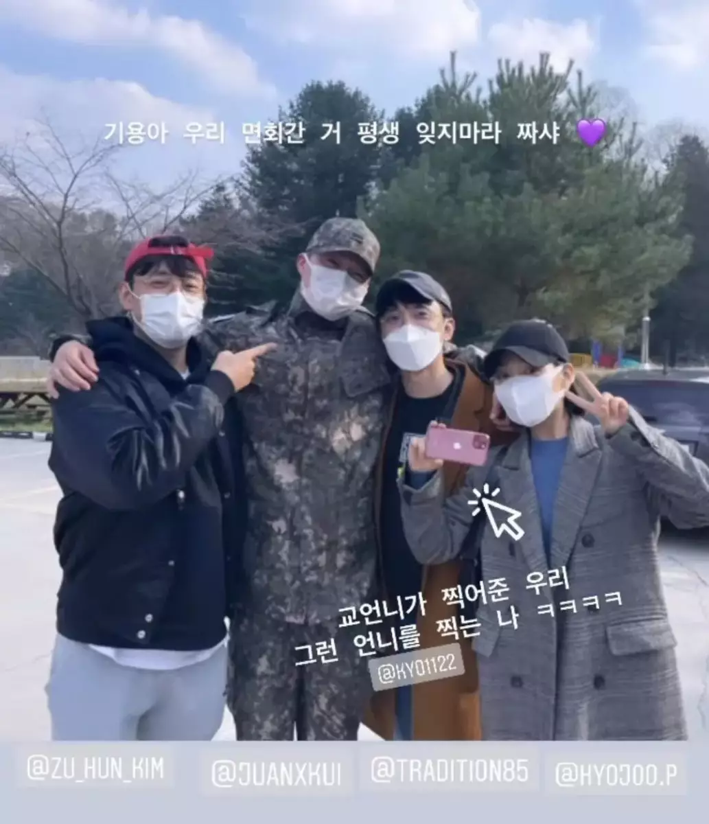 崔嬉序分享《現正分手中》一行演員去軍隊探望張基龍的合照(崔嬉序IG限時動態截圖)