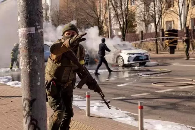 基輔,2月26日,烏克蘭士兵在一處軍事設施外警戒,路上的車輛遇襲起火。