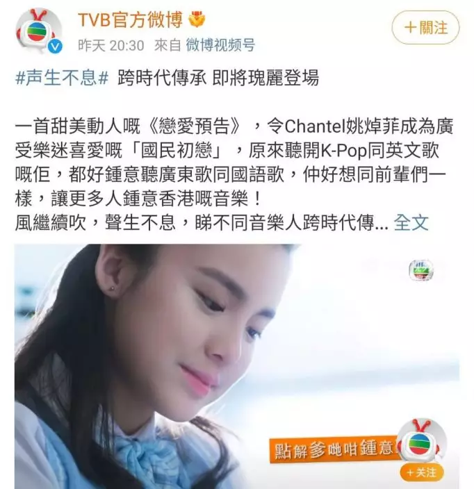 在TVB微博官網上有關《聲生不息》的宣傳,竟出現姚焯菲的相片。