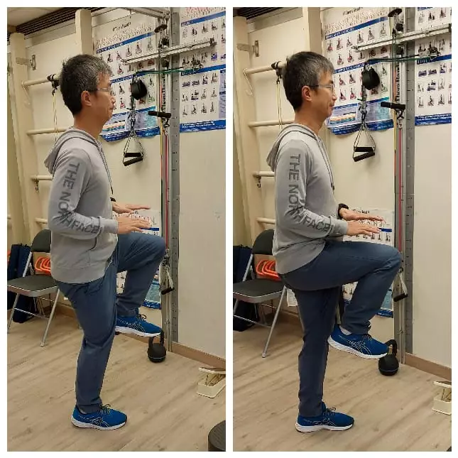 提膝伸展: 1.先站穩,讓單一膝蓋抬高約九十度 2.雙手自然微提如圖示,期間留意身體平衡,左右腳輪流做,重複以上過程。