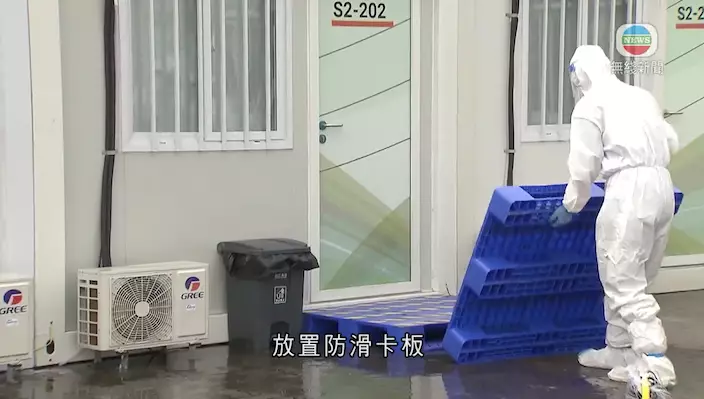 中心昨日(3月20日)就於青衣社區隔離設施開展水浸應急處理、維修預案演練。現場畫面見到,在水浸個案發生後,維保人員快速做好自身防疫措施,接受維修指示準備物資進入水浸區,優先保障住戶日常生活,例如快速放置防滑踏板,讓住戶能順利去到沖涼、廁所等功能性貨櫃;再用水泵抽水或將水掃走。