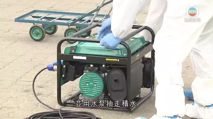 維修人員用水泵抽走積水。無綫截圖