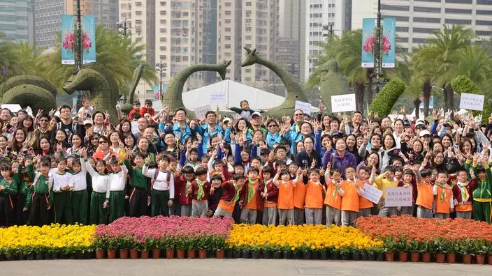 超過1100名來自25間學校的學生,今日在維園參加「賽馬會學童鑲嵌花壇」活動,在綠化義工的指導下,把3萬多株花卉植物鑲嵌成大型花壇「自然•藝展」。