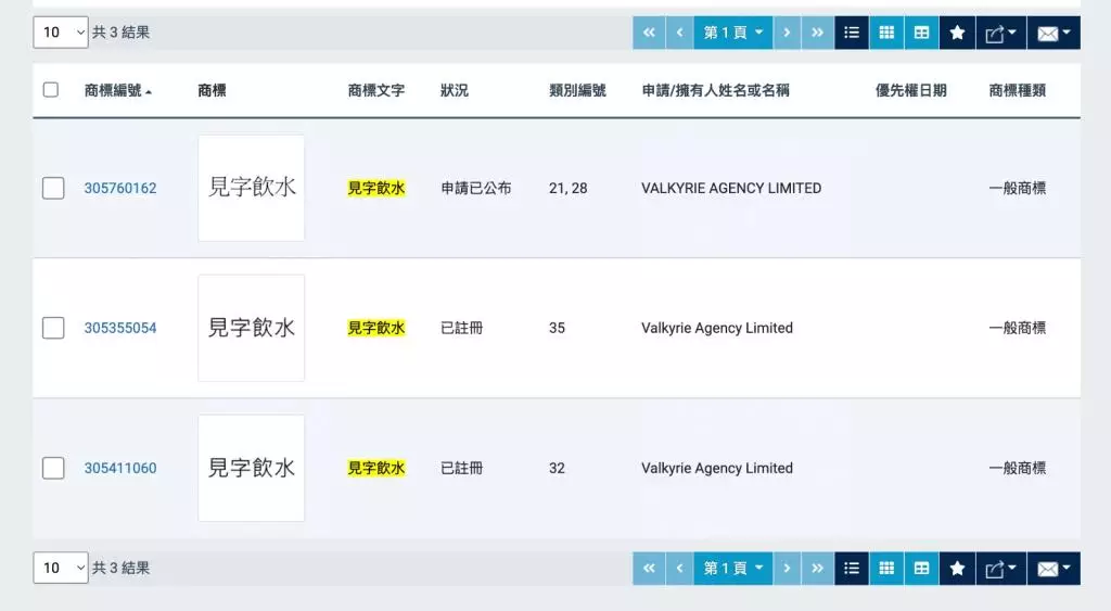 據知識產權署公開資料,「見字飲水」四字商標目前有三個商標註冊申請,於2020年8月至2021年12月先後提交通過,均由公司「Valkyrie Agency Limited」註冊。其中兩個申請已成功註冊,分別為飲品類和市場推廣服務類;其餘一個則仍在申請中,涉及家用器具類和遊戲玩具類。