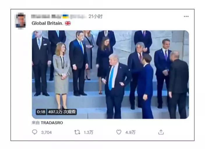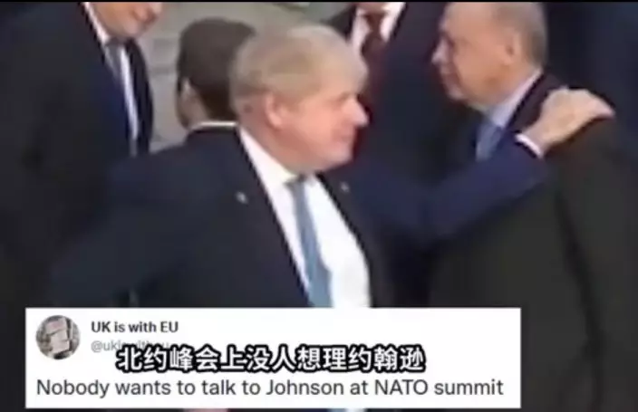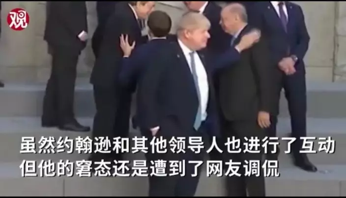 視頻顯示,北約各成員國領導人站在即將拍「全家福」的臺階上,愉快地互相問候,而英國首相約翰遜卻尷尬地站一邊,手插在兜裡,左顧右盼。而在他身後,法國總統馬克龍與其他歐洲領導人一一握手,相互攀談。