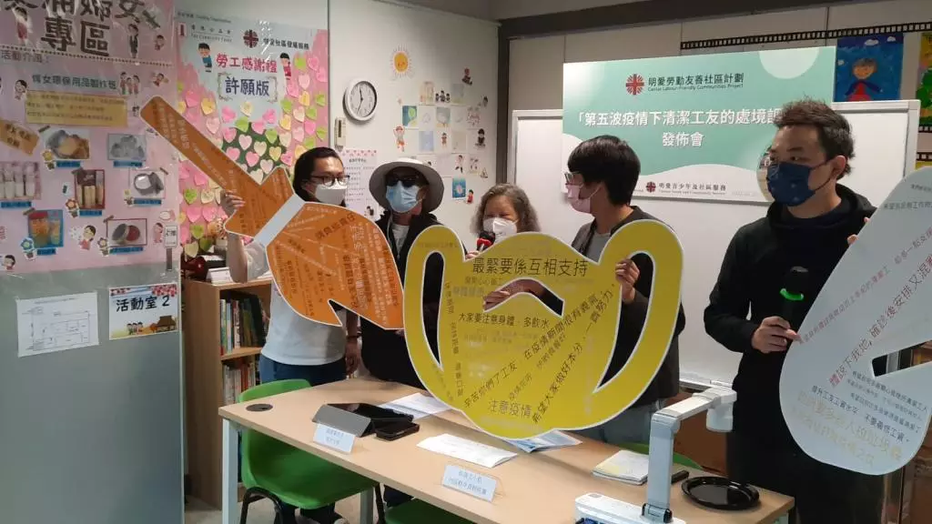 團體指第五波疫情以來,平均每3名工人就有1人確診,促請外判商應為工人提供合符工作風險的防疫裝備以及就超時工作提供相應補償。而清潔工人常被標籤為「不潔」、「帶菌者」,比一般大眾更容易被社交孤立,促請各界關注清潔工的精神健康。