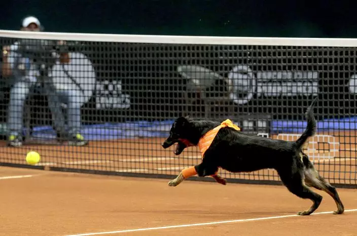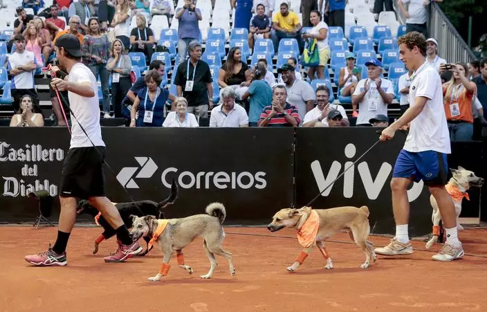 西班牙球手卡瓦列斯(Roberto Carballes)與葡萄牙的埃利亞斯(Gastao Elias)進行表演賽期間,四隻狗狗弗里達(Frida)、科斯特拉(Costela)、梅爾(Mel)和伊莎貝爾(Isabelle)在觀眾面前大顯身手,負責撿拾出界的網球。