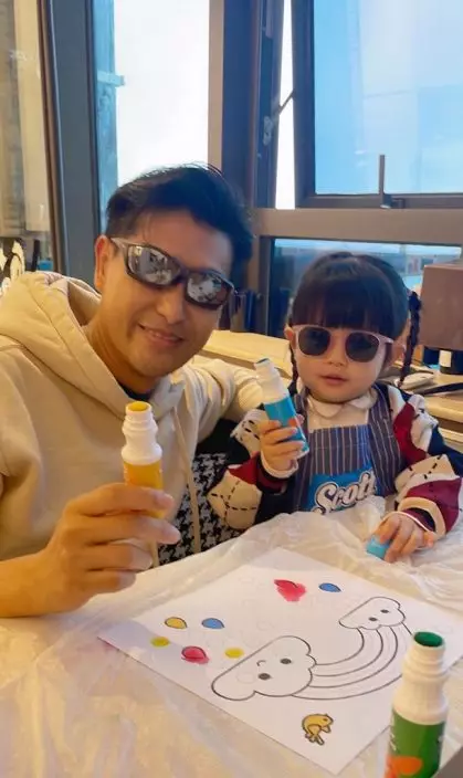 關心妍(Jade)同5歲半囡囡楊榮心(心心)一齊繪畫,心心畫咗公園,當中有滑梯、韆鞦及彩虹,最重要畫咗一家三口,加埋隻狗BUTTER。Jade表示心心的幼稚園行國際學校路線所以仲要返學,每日待囡囡上完網課就會自度關老師教育課程,「每日安排唔同活動,整鬆餅、啫喱、刨冰、Painting、唱歌堂、鋼琴堂,亦會安排挑戰比賽,喺屋企放啲三角型嘅Cone畀佢跑,練返啲體能。」為怕囡囡悶,Jade絞盡腦汁,「最近玩過BOTTLE FLIP,放啲水入水樽再拋,可以玩個幾鐘,玩完一個之後再挑戰兩個或3個,一家人可以比賽,係好好嘅親子活動。」