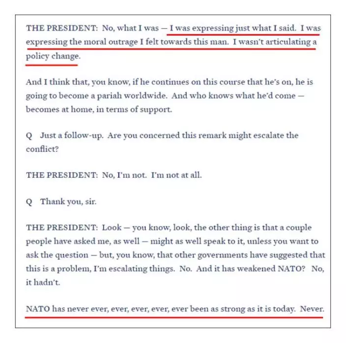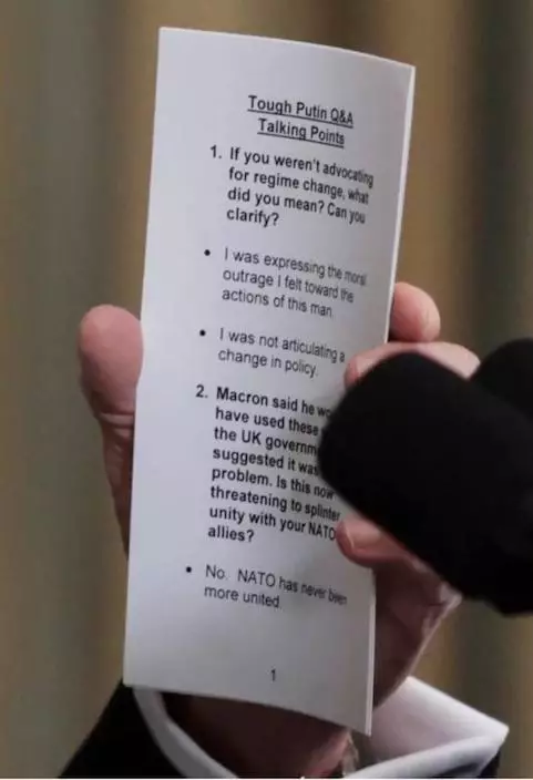 按照紙條上的建議答案,拜登應該回答:「我是在表達我對普京行為的道德憤慨;我說的不是政策上的改變。」