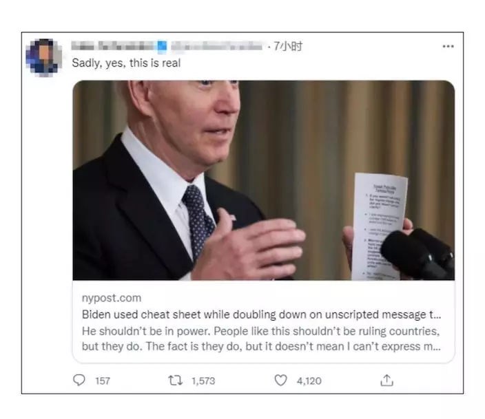 拜登回答記者提問時,雙手習慣性在空中比劃,現場媒體借機拍到了他手中的「貓紙」,上面的內容清晰可見。