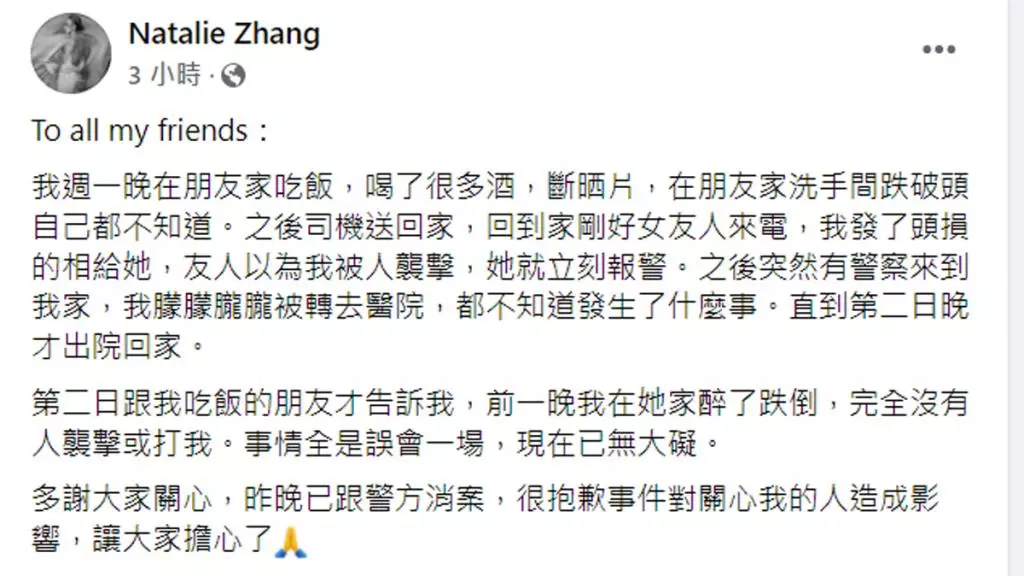 張利華在發帖指,周一晚在朋友家中吃飯,「喝了很多酒,斷晒片」,其間於洗手間跌倒,不為意頭受了傷。司機將她送回家後,剛好女友人來電,她將頭部損傷傳送給對方,對方以為她遇襲而報警。她指,其後有警察到場,「我朦朦朧朧間被轉去醫院,都不知道發生了甚麼事」,直至翌日晚上才出院回家。