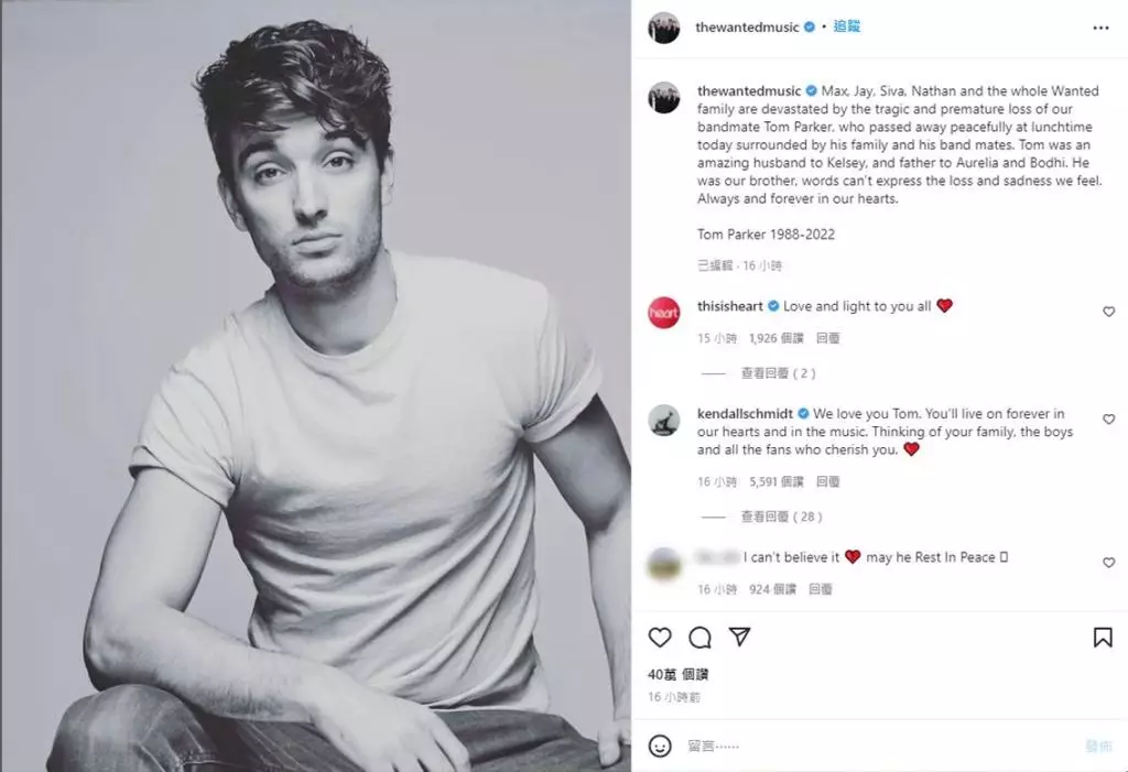 英國男子組合The Wanted成員Tom Parker病逝,終年33歲。