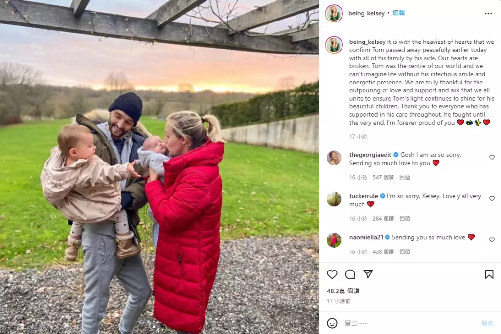 Tom的太太Kelsey貼出一家合照,宣佈老公死訊。