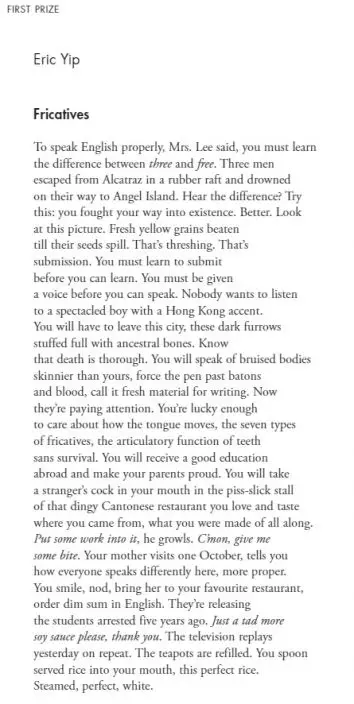 Eric Yip的奪冠詩題為「Fricatives」,為英文發音術語,與港人難克服的「f」和「th」等發音有關,如「free」和「three」。詩篇以此概念觸及多種主題,例如老師說要學好英文便要分清發音,並以一些事件饒成急口令示範差異。