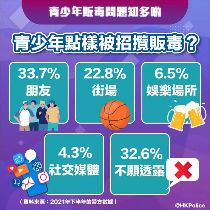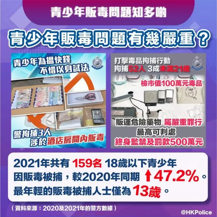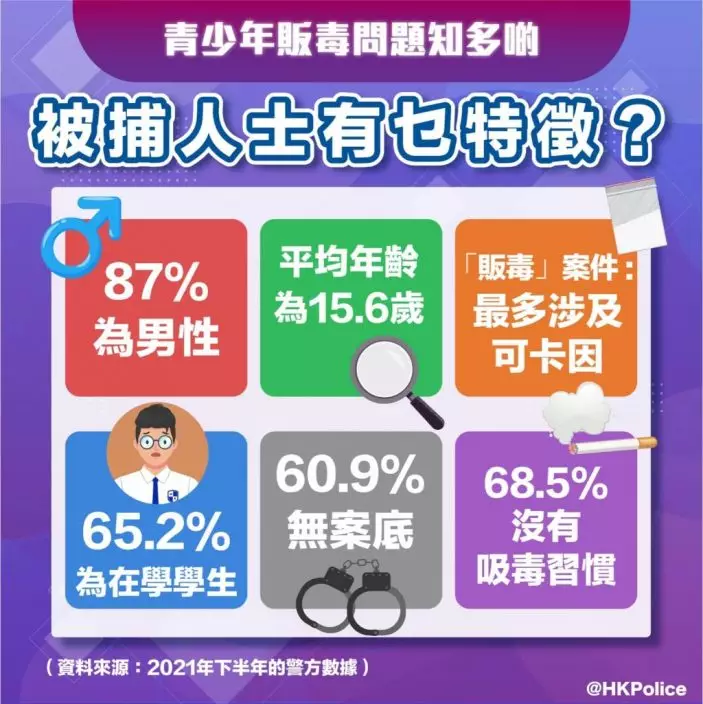 警方表示,2021年共有159名18歲以下青少年因販毒被捕,較2020年同期上升47.2%,最年輕的販毒被捕人士僅為13歲。被捕人士中87%為男性,平均年齡為15.6歲,65.2%為在學學生,60.9%無案底,68.5%沒有吸毒習慣,販毒案件最多涉及可卡因。而33.7%青少年經由朋友招攬販毒,22.8%經由街場,6.5%經由娛樂場所,4.3%經由社交媒體。不過有32.6%青少年不願透露。