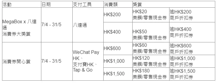 多間食肆及零售商戶亦會於推廣期內推出逾40項商戶消費券購物優惠,全面涵蓋4個領取消費券的儲值支付工具。不論顧客以任何支付工具消費購物,蒞臨MegaBox都可以盡享盡享連環消費著數。