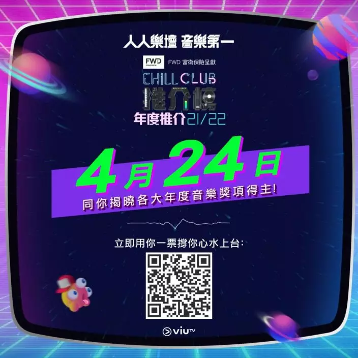 一年一度的《Chill Club推介榜 年度推介21/22》,日前在ViuTV的官方FB中宣佈將於本月24日舉行,不過舉行地點仍未有公佈,不過由於政府有意在本月21日放寬社交距離措施,表演場所有望可以重開,因此ViuTV大有可能可以舉行實體頒獎禮,可以讓觀眾歌迷入場支持一眾歌手。