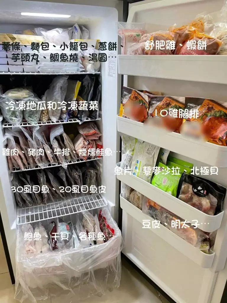 這位台灣主婦在「爆廢公社」分享自己的戰利品照片,並表示「疫情拉警報,食材囤好囤滿我是食材大富翁。」只見其家中的2台雪櫃已經被各式各樣的食材塞滿,包括各種不同的肉類、海鮮、蔬菜、加工食品等食材,可說是應有盡有,甚至有網友替她數了一遍,冰箱裡竟然塞下了44顆三文魚頭、80塊雞肉等,東西雖多但一點不雜亂,這位主婦還將全部食材一一分類,並整齊放入雪櫃內,甚至還附上了每餐食材的精美擺盤,畫面可謂是相當的震撼且治愈!