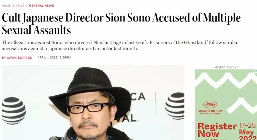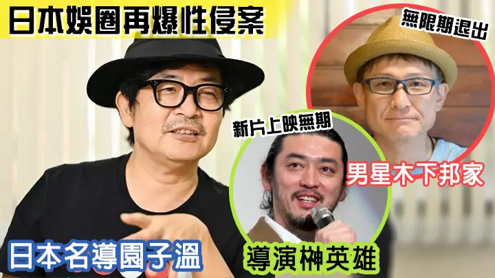 上月日本導演榊英雄及男星木下邦家均被爆性侵多名女子,榊英雄執導新片即上映無期,木下亦宣佈無限期退出演藝界。近日《愛之剝脫》、《新宿天鵝》等片的日本名導園子溫都涉性侵女演員,日前雜誌《週刊女性》公開兩名受害女子指控園子溫的內容,包括他利用自己導演的權力及地位,透過試鏡性侵多名女演員,又或是強姦未遂等,其中一名受害人稱園子溫提出可安排她一個角色,但要跟他上牀,她拒絕後,園子溫找來另一位曾合作的女演員到場,更在她面前性交,一名助導帶她離開,她以為獲救後,助導竟載她到酒店。而本月3日,演員松崎悠希亦大爆園子溫的惡行。