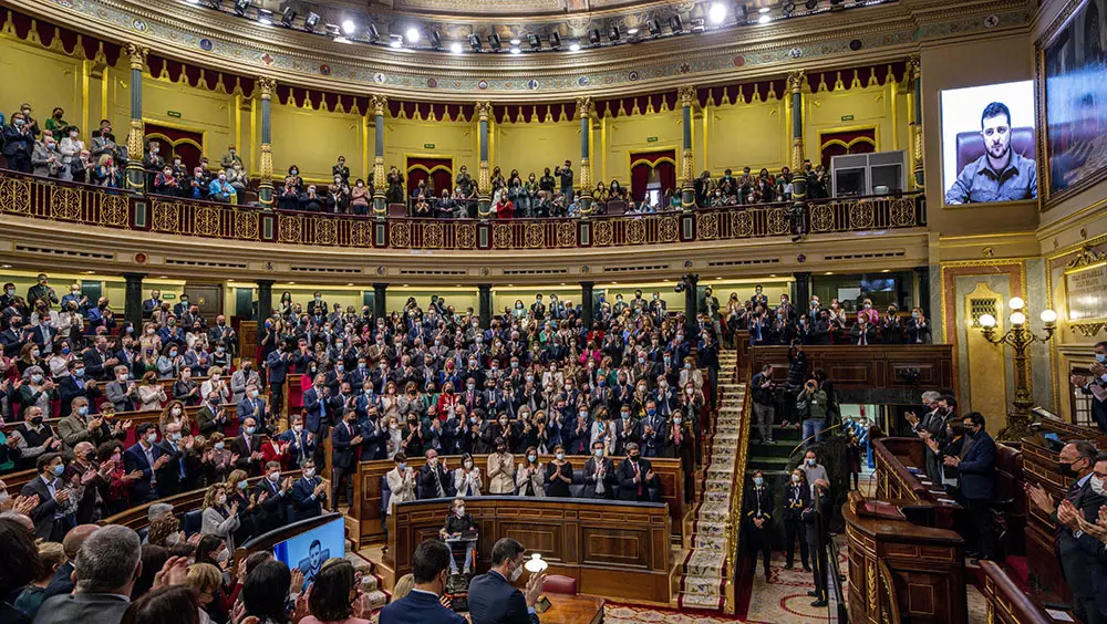 演說結束,議員全體起立鼓掌致意。西班牙總理桑傑士(Pedro Sanchez)也以簡短演說回應澤倫斯基,除了譴責俄羅斯總統普京外,又強調「烏克蘭可以依靠西班牙」,表達西班牙將持續堅定支持烏克蘭。