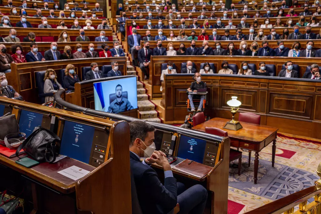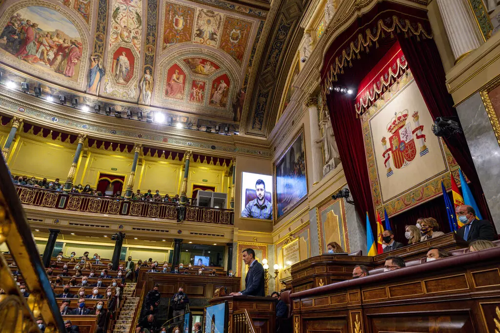 烏克蘭總統澤倫斯基以視像方式在西班牙國會發表演說,是布查鎮慘案曝光後,首度在他國國會發表演說。他以西班牙內戰期間「格爾尼卡大轟炸」事件,借喻俄軍罪行與烏國平民傷亡悲劇,請求西班牙提供武器、並強化對俄羅斯的經濟制裁。