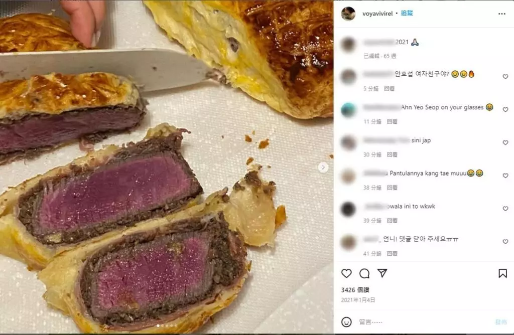 朴智賢曾上載威靈頓牛柳的照片,而安孝燮拍《紅天機》時曾力讚這道美食(網上圖片)