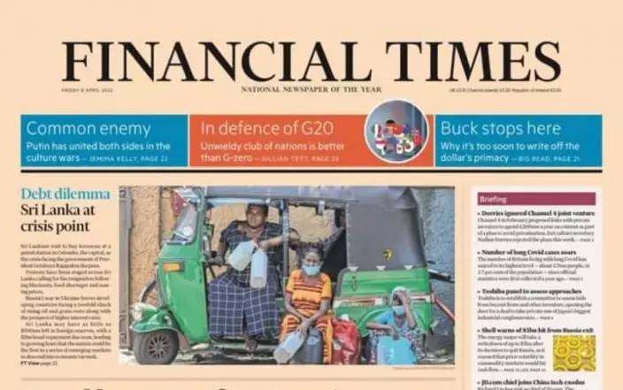 英國《金融時報》在頭版刊登照片報道,南亞國家斯里蘭卡政府面臨的危機進一步惡化。隨著當地出現停電、食物短缺及物價飛漲後,抗議者已要求總統拉賈帕克薩引咎辭職。