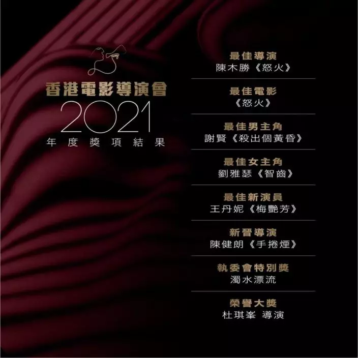 謝賢之前已在「香港電影評論學會大獎」憑電影《殺出個黃昏》獲得最佳男演員,今日(12日)他與憑電影《智齒》獲得「最佳女主角」的劉雅瑟齊齊再下一城,在今日(12日)公布的《香港電影導演會2021年度獎項》再度封影帝及影后。
