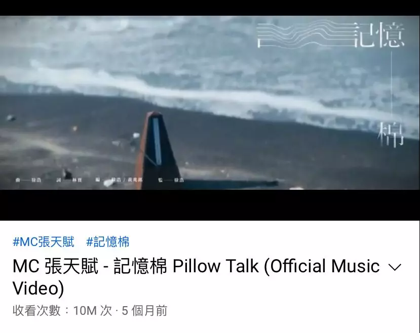 歌手張天賦(MC)去年推出五首個人單曲,繼歌曲《反對無效》MV在YouTube破1100萬點擊後;另一首在10月推出的《記憶棉》亦大受歡迎,MV上架短短5個月,昨日(12日)亦已衝破1000萬大關,成為第二首千萬點擊的歌曲,成績驕人,實在可喜可賀。