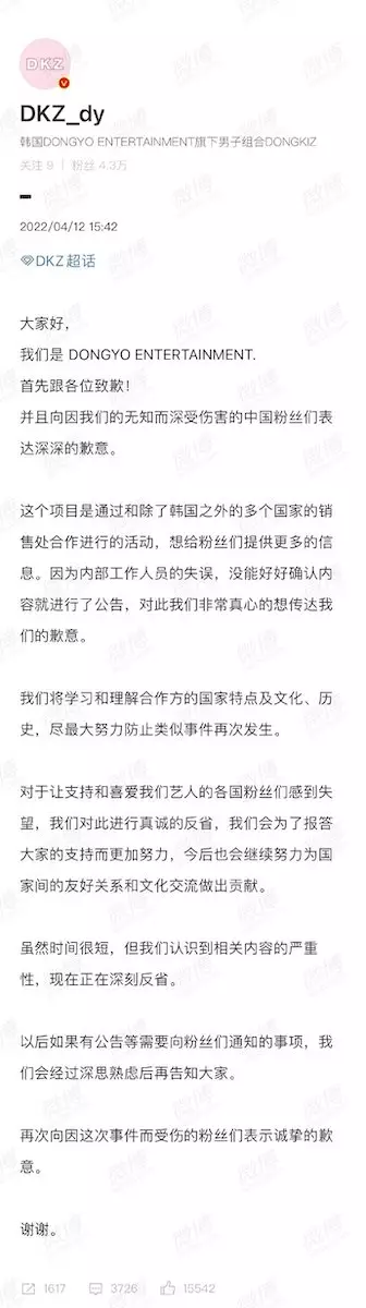 DONGYO娛樂很快便發現問題所在,並立即將相關貼文刪除。隨後公司亦透過微博官方帳號發文,向因為他們的無知而深受傷害的中國粉絲表達深深的歉意。公司解釋活動是和多個國家的銷售處進行合作,而內部員工又因為失誤未有好好確認內容便發出了公告,才會造成今次的爭議。為了防止類似事件再發生,他們將會努力學習和理解合作方的國家文化、特點和歷史。對於讓一直支持和喜愛DKZ的各國粉絲感到失望,公司也會進行真誠的反省,以後更努力位國家間的友好關係和文化交流作出貢獻。最後DONGYO娛樂再次強調他們已經意識到問題的嚴重性,以後如果有需要向粉絲的通知事項,也會經過深思熟慮才告知大家。