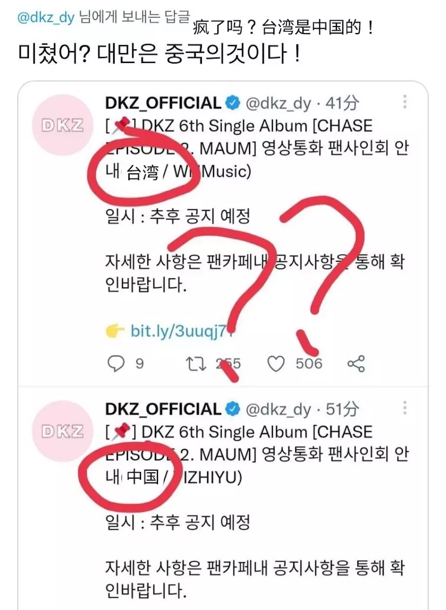 原韓國男團DONGKIZ因為成員朴宰燦主演BL劇後人氣急升,組合成功找到新出路,乘勢加入3名新成員為勢泫、珉奎和起碩,並改名DKZ再出發。他們於昨日(12日)以單曲專輯CHASE EPISODE 2. MAUM回歸樂壇,隨即展開一連串的宣傳活動,包括舉行網上簽售會與粉絲見面。不過DKZ的所屬社DONGYO娛樂就犯下一個錯誤,讓內地網民大感不滿,最終更要公開道歉收場。