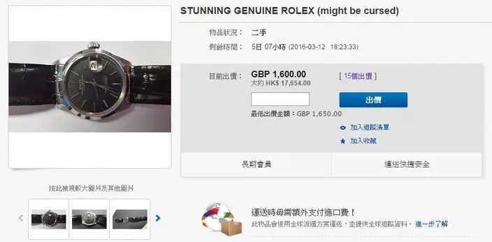 英國一名會計師早前在ebay上以低價出售一隻聲稱是「受詛咒」的勞力士(Rolex)手錶,他自從戴上這隻手錶之後就惡運連連,幾乎連命都無,所以要將手錶易主。