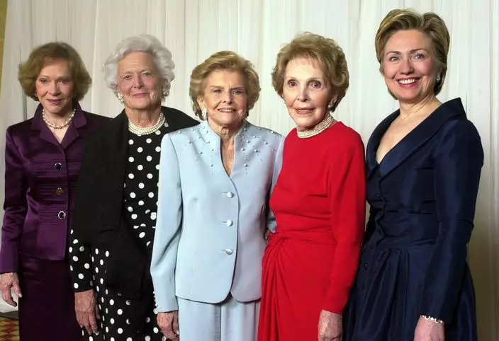 前總統老布殊的夫人芭芭拉(右2)和前第一夫人希拉莉。(AP圖片)