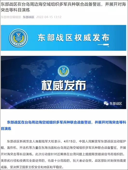 既然美國政府沒有用實際行動兌現不支持「台獨」的承諾,解放軍就採取實際行動來兌現「台灣是中國一部分」的事實,用訓練行動展示維護國家主權和領土完整的決心。解放軍東部戰區新聞發言人施毅15日表示,東部戰區當天出動驅護艦、轟炸機、殲擊機等力量在東海當面和台島周邊海空域組織多軍兵種聯合戰備警巡,並展開對海突擊等課目演練。