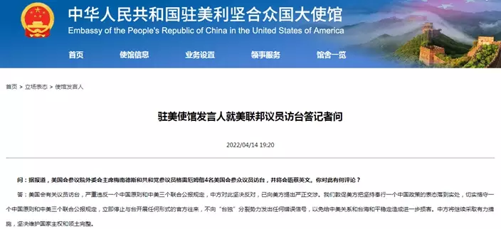 同在15日,國防部新聞發言人吳謙表示,近期,美國國會議員不顧中方強烈反對,蓄意挑釁,竄訪台灣。中國人民解放軍厲兵秣馬,將採取一切必要措施堅決挫敗外部勢力干涉和「台獨」分裂圖謀,堅決捍衛國家主權和領土完整。