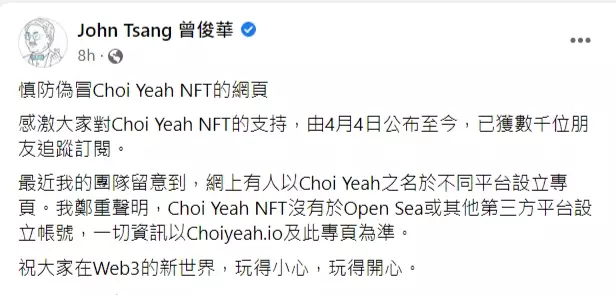 曾俊華在其社交媒體表示,其團隊留意到,網上有人以「Choi Yeah」之名於不同平台設立專頁。他鄭重聲明,Choi Yeah NFT沒有於其他第三方平台設立帳號,一切資訊以Choiyeah.io及其個人專頁為準。希望網民在互聯網新世界「玩得小心,玩得開心」