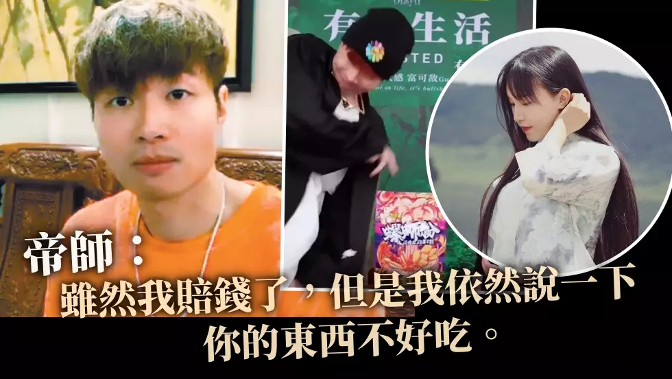 對此,帝師回應稱:「自己賣出去1萬多(元),賠了20萬(元)。雖然我賠錢了,但是我依然說一下,你的東西不好吃。」他表示,自己在評測一些品牌時確實做了不恰當的事情,「第一,不應該,同樣兩個競品不應該踩一抬一,也不應該漏(露出)人家品牌,扔進垃圾桶。」接著話鋒一轉稱,「當時人家舉報我,給我兩個選擇,你是要道歉還是要賠錢,賠錢要賠很多,我情願賠錢也不道歉,因為道歉代表我否定了我的態度,我做的事情就變成了假的。」