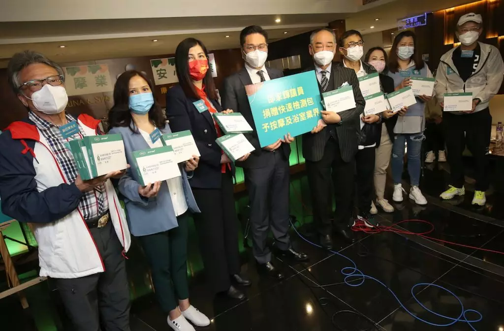 而在這兩年來一直協助業界復業的立法會議員邵家輝則捐贈3,000份快速檢測劑予業界前線員工,為按摩業打打氣。邵家輝喜見業界終能復業,但現時確診數字仍處於高水平,呼籲按摩院營運者跟足政府規定名限制,以保障員工及顧客,又希望政府能夠加強與業界溝通,聆聽業界的意見,在抗疫同時平衡業界的生存空間。