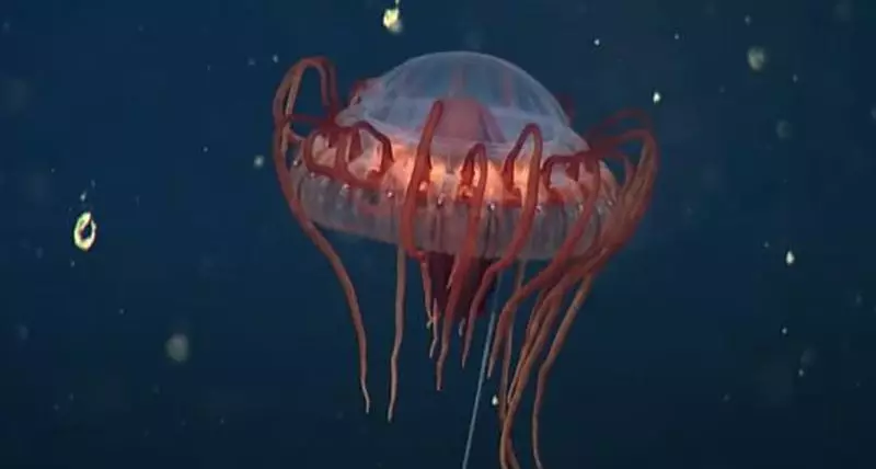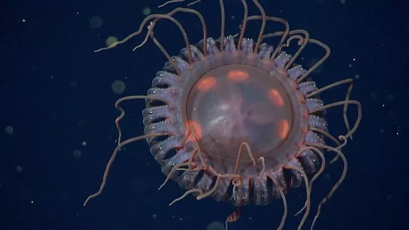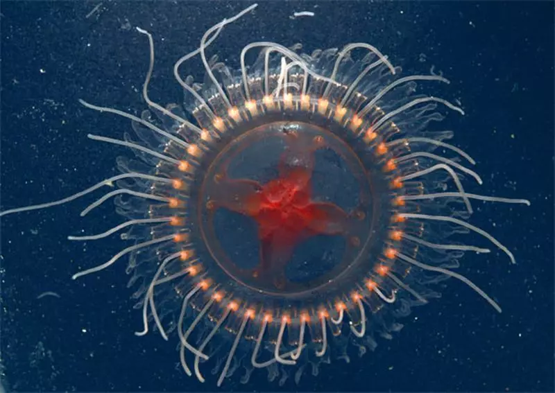神秘莫測的深海世界,一直是海洋生物學家探究瑰寶的地方,那裏蘊藏了不少至今仍未被發現的神秘生物,甚至還有不少形狀詭異的「海怪」。最近美國海洋生物學家為一種新物種命名,牠外形怪異得似外星生物,又好似被無數觸鬚包圍的「大眼睛」,而且還會發出紅光,原來其真身是一種深海礁環冠水母,但因為一直生活在深海難以被發現。