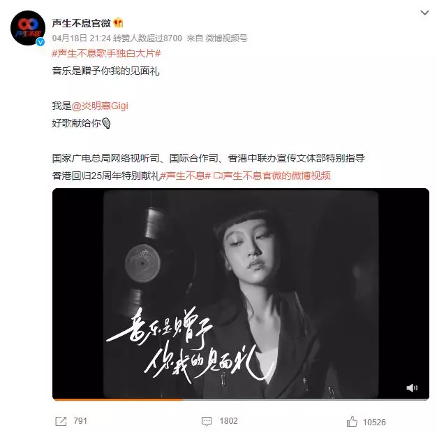 TVB與內地電視台攜手打造的音樂節目《聲生不息》,集內地及香港知名歌手參與,歌手陣容包括楊千嬅、李克勤、炎明熹(Gigi)、李玟、葉蒨文、林子祥等,可謂相當鼎盛!節目將於本月24日播出,眾星紛紛在官方社交網拍片宣傳,其中Gigi的影片點擊率及點讚量跑贏前輩千嬅、克勤,氣勢如虹,並獲網民封為「GEM 2.0」!