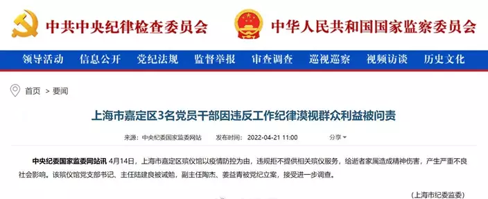 據「廉潔上海」消息指,4月14日,上海嘉定區殯儀館以疫情防控為由,違規拒不提供相關殯儀服務,給逝者家屬造成精神傷害,產生嚴重不良社會影響。該殯儀館黨支部書記、主任陸建良被誡勉,副主任陶傑、姜益青被黨紀立案,接受進一步調查。