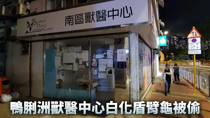 鴨脷洲一間獸醫中心遭人偷龜。下午5時許,警方接獲南區獸醫中心的職員報案,指一隻白化盾臂龜遭人偷走,警員到場調查,又翻查閉路電視,未有人被捕,將案件列作盜竊。