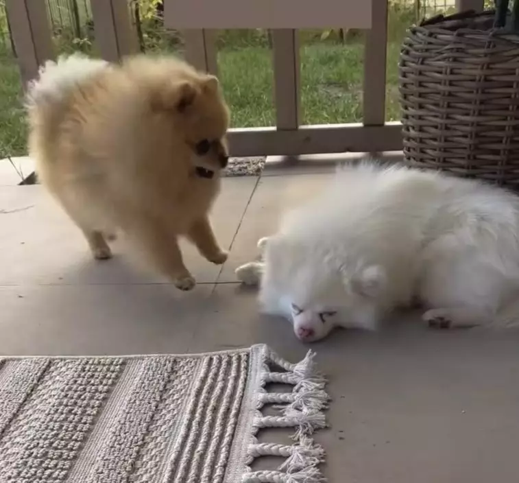 貼心博美犬不忍失聰同伴錯過迎接主人,遂上前溫柔喚醒對方齊齊迎接,有愛互動融化人心。