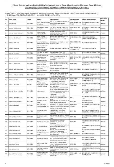 政府早前公布向私家醫生免費提供上述兩款新冠口服抗病毒藥物,以便利私家醫生向合適的新冠病人處方。衞生署4月11日發信通知已登記使用醫健通的私家醫生可透過特設網上平台,要求提供兩款新冠口服抗病毒藥物。已在醫健通登記並取得新冠口服藥物作治療新冠病毒的私家醫生名單已上載於www.coronavirus.gov.hk/pdf/tp_pd_antiviral.pdf,方便市民接受治療。該名單會因應醫生數目轉變而適時更新。根據名單所示,有212名醫生在名單之上,診所遍及港九新界。